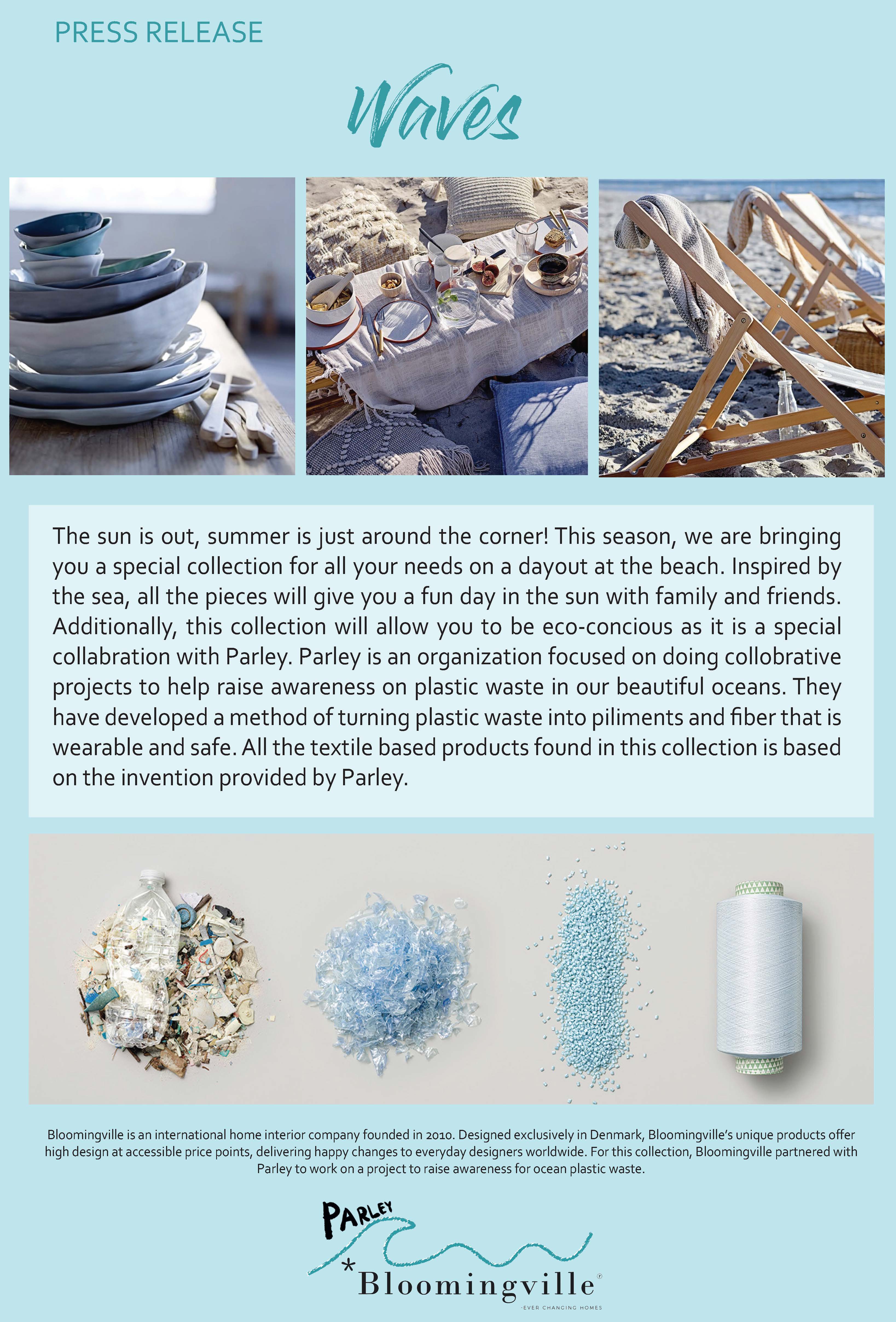 Concept proposal for Bloomingville on a collaboration with Parley, an organization that focuses on raising awareness for ocean plastic pollution whom have developed a method to turn plastic waste into safe-to-wear filaments and fiber.