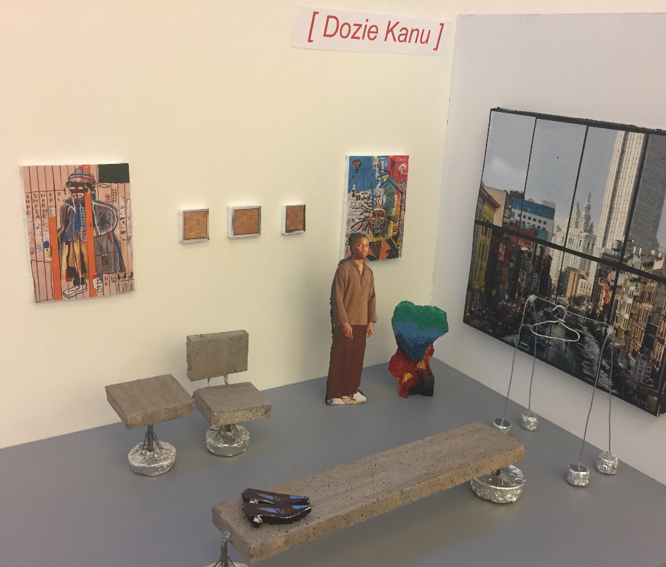 We had created a small scale physical model of how we envision the exhibition display to be: our ambition was to create Dozie Kanu’s art gallery exhibition in New York with the new collection. To showcase this we created a window with the view of New York. On the other side of the wall, we put Jean-Michel Basquiat’s work to create a street culture atmosphere.