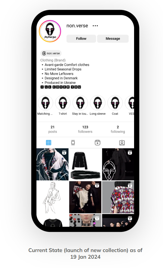 Utilizing Instagram and a new website, a proposal of launching fashion designer Myroslava Vetokha's re-branded fashion brand: Nonverse. Our campaign idea is to put more focus on 1 social media channel, Instagram in aid to help pushing for a brand relaunch. This is with the goal to push Myroslava's current following into her brand account to separate business content with her personal content. This is also done in hopes to get people become more aware that her products are for sale, which is where having a webshop will come in handy with her limited collections that she intends on selling in the long run.