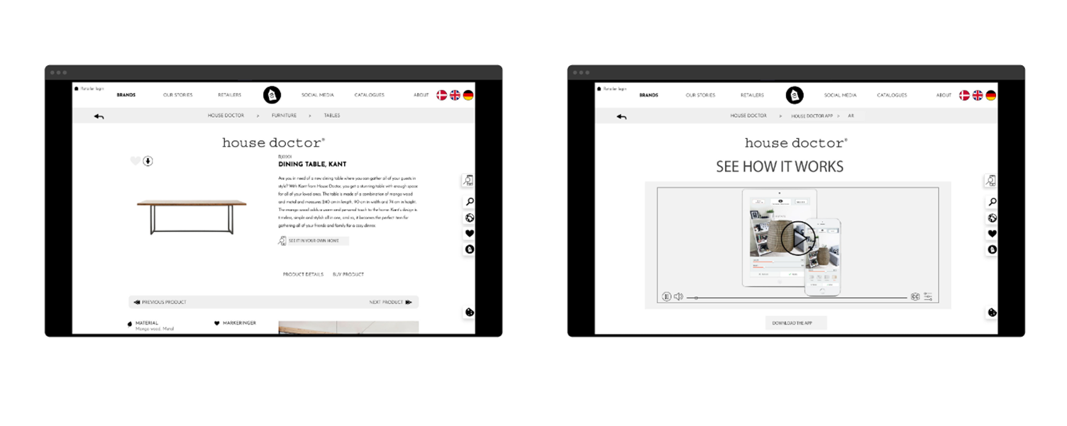 House Doctor ApS is a Scandinavian interior design brand with 3 sub-brands: Meraki, MONOGRAPH, and Nicklas Vaché. For this problem-based learning project, we have chosen to focus on the parent brand, House Doctor. Our proposal to ncrease online market presences is by incorporating web-based augmented reality directly on House Doctor's website. With their products being in an online showroom, users can select "see more" on a product allowing a 3D render of the product that can be seen in "reality" through phone/tablet's camera. In addition, it will link to the nearest retailer store for House doctor.